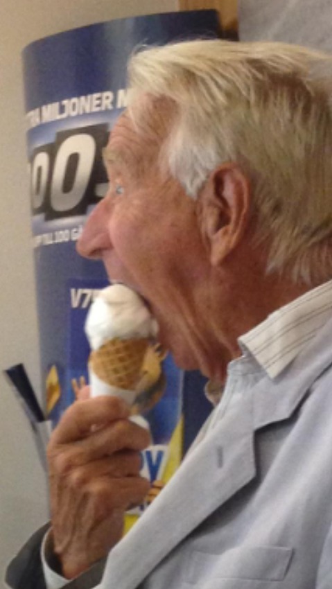 Den här äldre herrn som gapar stort och unnar sig en glass.