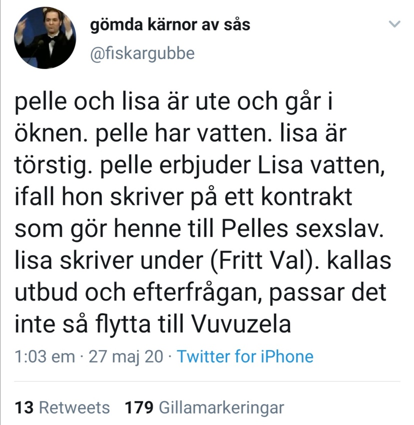 och man kan och bör absolut argumentera mot satir, för att satir funkar bara om det finns en saklig grund bakom den. humor utan kontext är inte humor. om du är ledsen över att svenska regeringen ger 1% av vårt bni för att motverka effekten av pandemin i utsatta områden får du göra det. men att skriva ditt inkompetenta gnäll ovanpå en bild gör det nt till satir