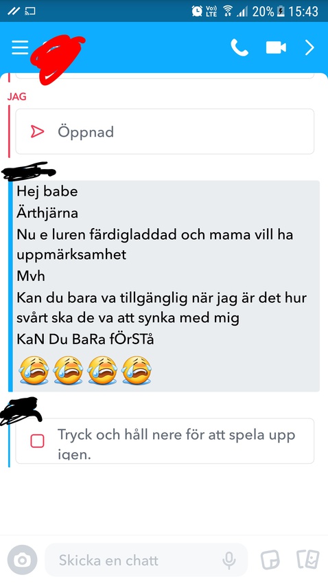 Hade slut på medicin igår o kunde ej hämta ut pga bor i skogen o båda apoteken inom 3 mils avstång va stängda o nu e ja fuckad i skallen o såg bild på en människa som förstört mig så jävla mkt o vill ba SPY samt hongla med min babyboi pga han e min big fart.