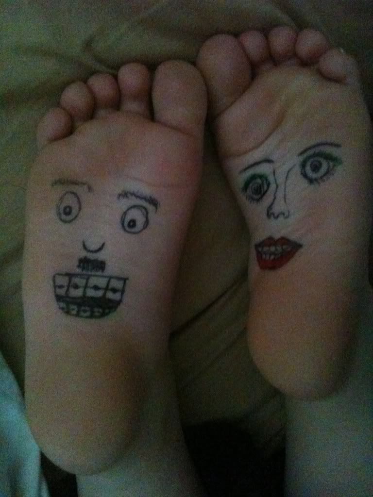 Hittade några tuschpennor, så jag ritade lite under syrrans fötter. Moget! Btw hon sover c: