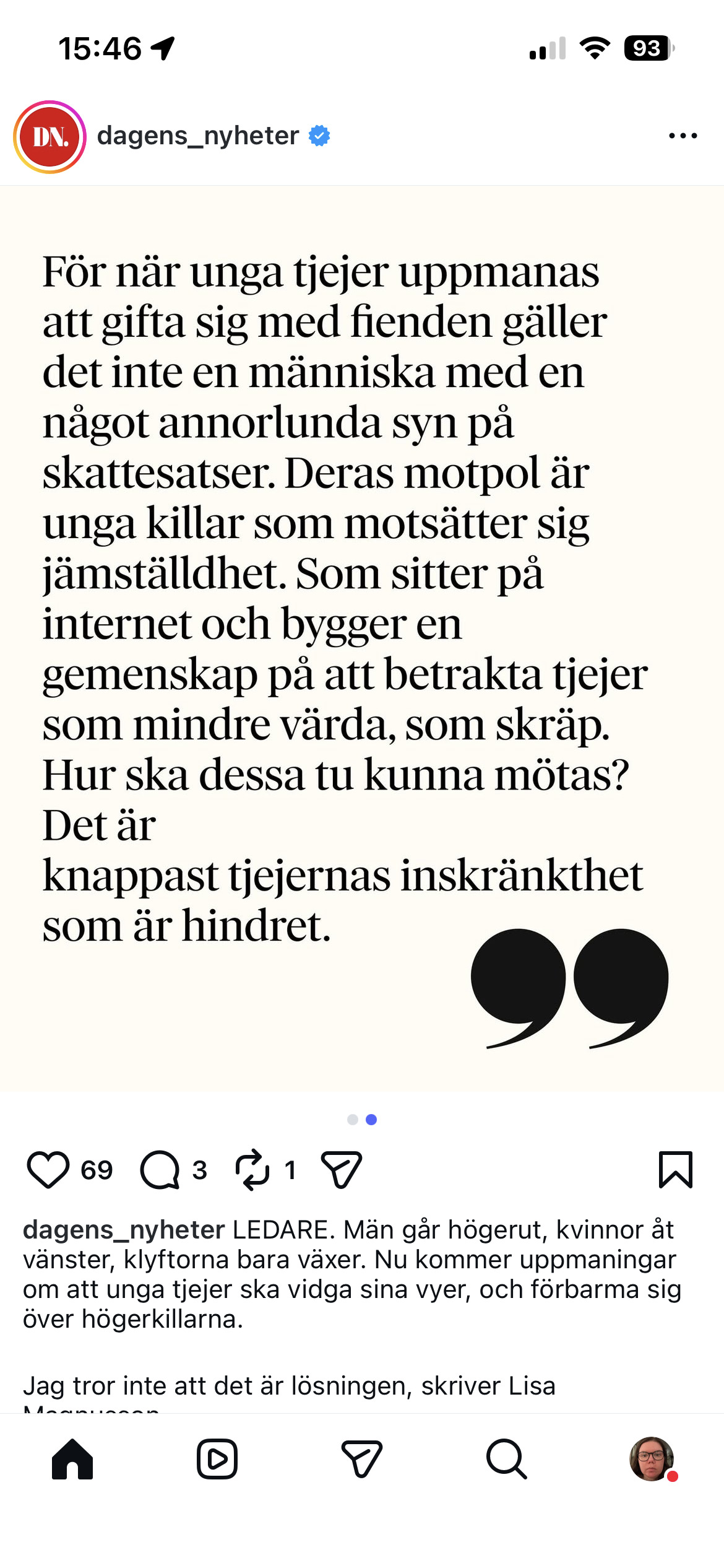 Får alltid lite ångest när sysselsättning kommer på tal. Det leder alltid in på frågor om varför man är sjukskriven och hur länge och så. Det tar emot att göra sig sårbar för någon annan som kan avvisa en. Man vet ju aldrig vad folk bär på för fördomar om en. Så det är tungt. Men går inte att komma undan det om man vill komma närmare någon. Då måste man ta risken. It sucks, but it’s the only way.