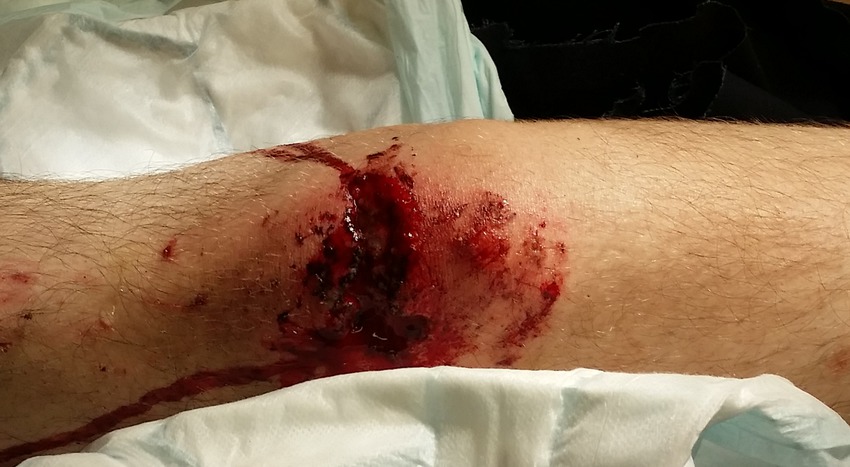 Ramlade från ett (lågt) tak när jag var liten och slog i knät i ett spetsigt järnstaket. Blev ett hål så djupt att man såg benet. Shudders :(